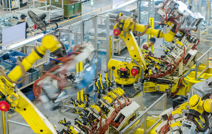 ??2025年10月9日,浙江省湖州市長興經濟技術開發區的長興地通汽車部件有限公司技術人員操控工業機器人生產新能源汽車配件(無人機照片)。(新華社發 譚云俸/攝)