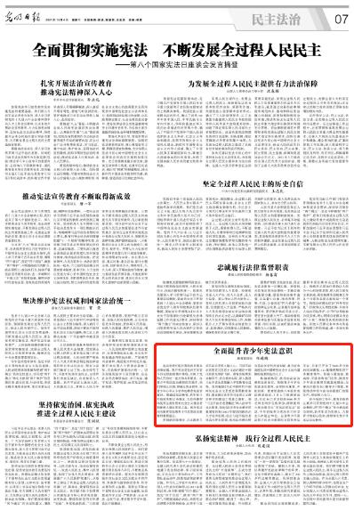 在今后的工作中,教育系統將認真學習貫徹黨的十九屆六中全會精神,把“兩個確立”作為最高政治原則,始終牢記為黨育人、為國育才的初心使命,持續深化青少年憲法法治教育。(本文刊發于《光明日報》2021年12月4日07版)