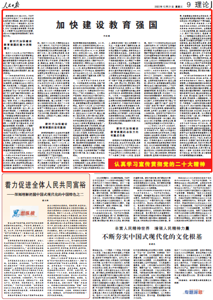 教育是國之大計、黨之大計。習近平總書記所作的黨的二十大報告首次將“實施科教興國戰略,強化現代化建設人才支撐”作為一個單獨部分,充分體現了教育的基礎性、戰略性地位和作用,并對“加快建設教育強國、科技強國、人才強國”作出全面而系統的部署,為到2035年建成教育強國指明了新的前進方向。