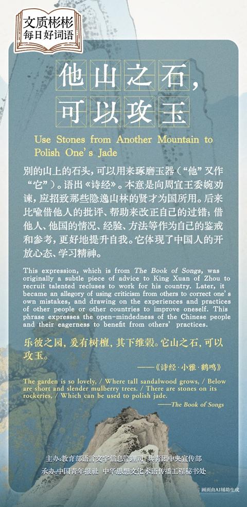 別的山上的石頭,可以用來琢磨玉器(“他”又作“它”)。出自《詩經》。本意是向周宣王委婉勸諫,應招攬那些隱逸山林的賢才為國所用。后來比喻借他人的批評、幫助來改正自己的過錯;借他人、他國的情況、經驗、方法等作為自己的鑒戒和參考,更好地提升自我。它體現了中國人的開放心態、學習精神。