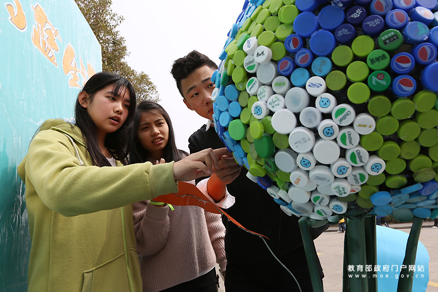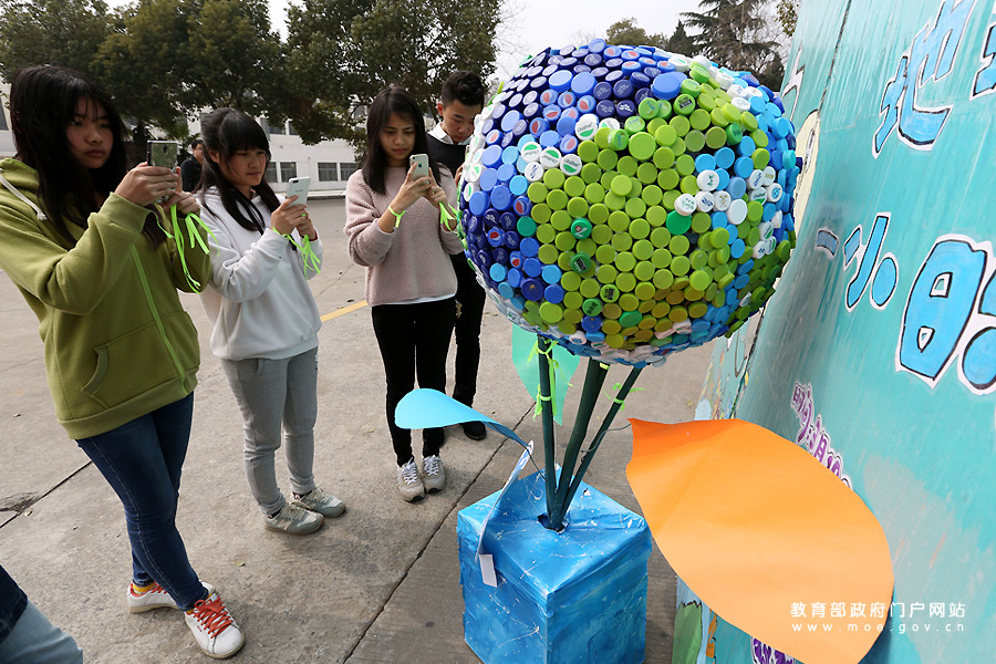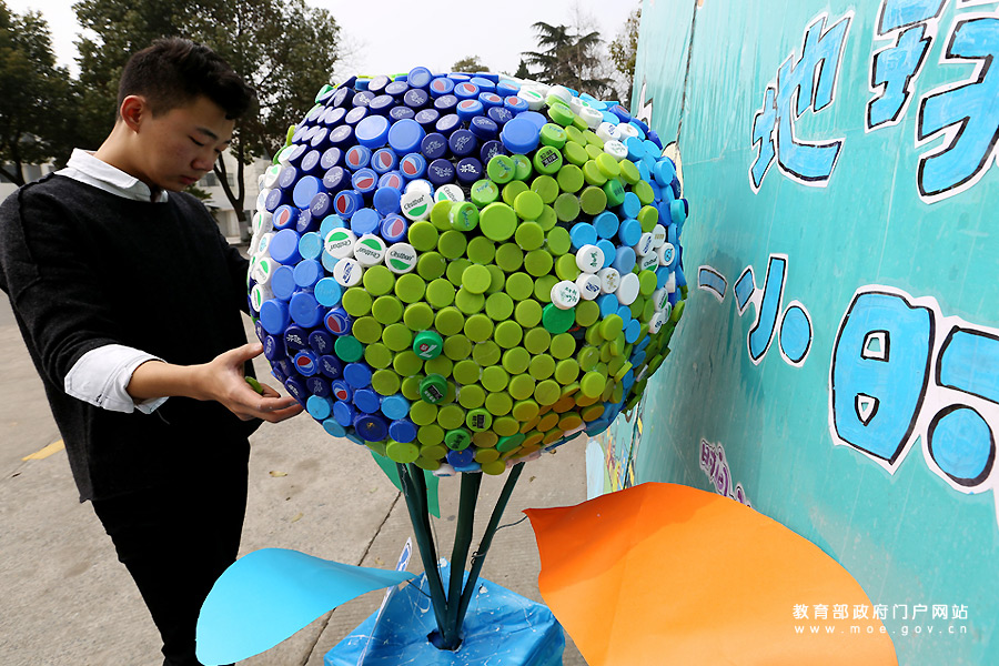 響應“地球一小時” 大學生用2016個瓶蓋搭地球模型