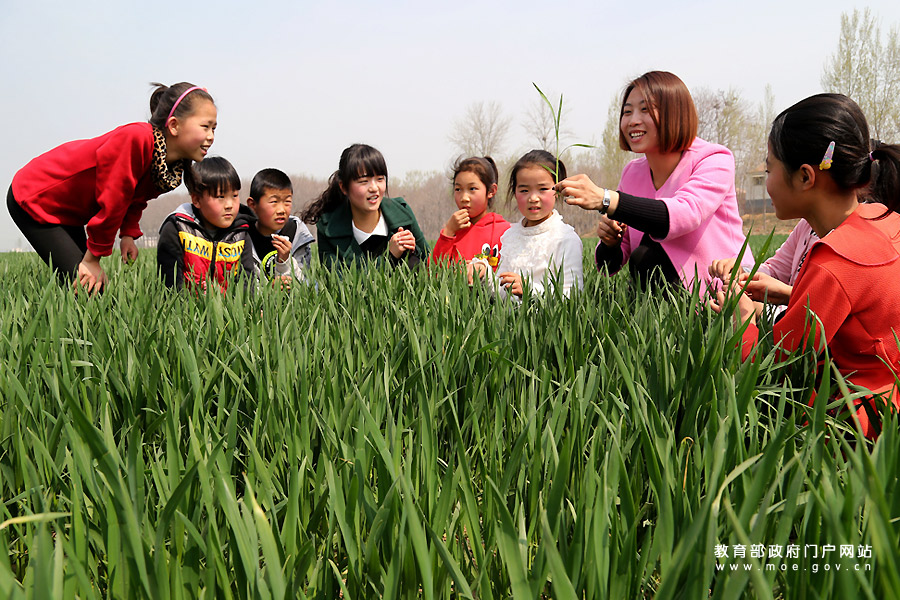 北平皋小學老師李敏杰在校園里給學生講解自然知識。(徐宏星/攝)