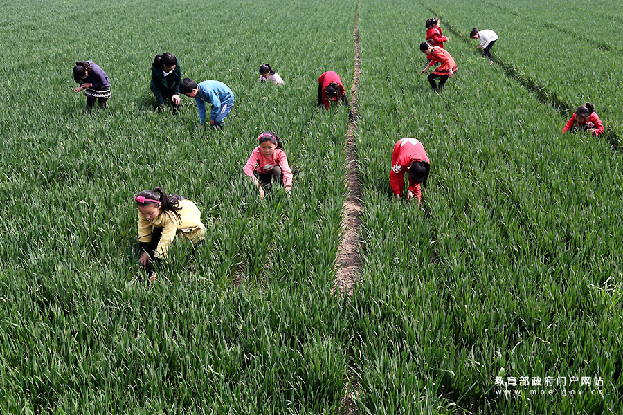 北平皋小學學生在校勞動實踐基地的麥田里拔草。(徐宏星/攝)