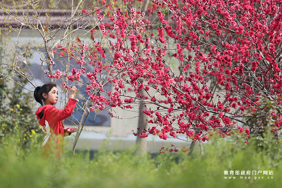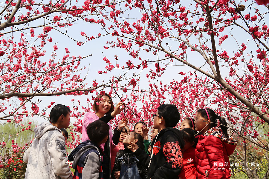 河南省溫縣趙堡鎮北平皋小學學生在校園里觀察碧桃花。陽春三月,河南省溫縣趙堡鎮北平皋小學花團錦簇,春意盎然,該校舉行“尋找春天”主題活動,孩子們在老師指導下在校園里踏春賞花,了解自然知識,學習農事活動,感受大好春光。(徐宏星/攝)