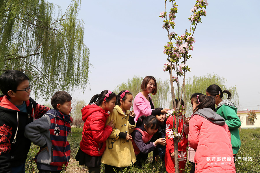 北平皋小學老師在校園里指導學生觀察海棠花。(徐宏星/攝)