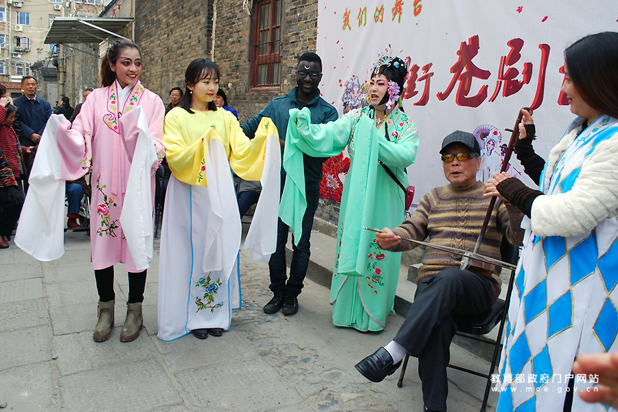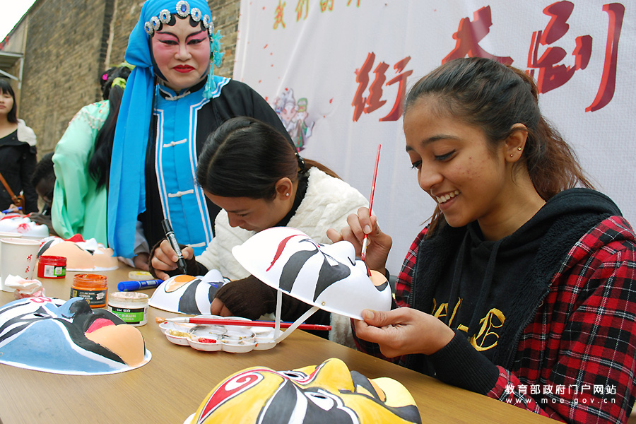 近日,江蘇大學來自贊比亞、韓國、印度等國的留學生走進鎮江市金山街道楊家門社區街巷劇場,在當地戲曲票友指導下畫戲曲臉譜,學習戲曲唱腔及其表演藝術,體驗中國傳統的戲曲文化。(石玉成 平娜/攝)