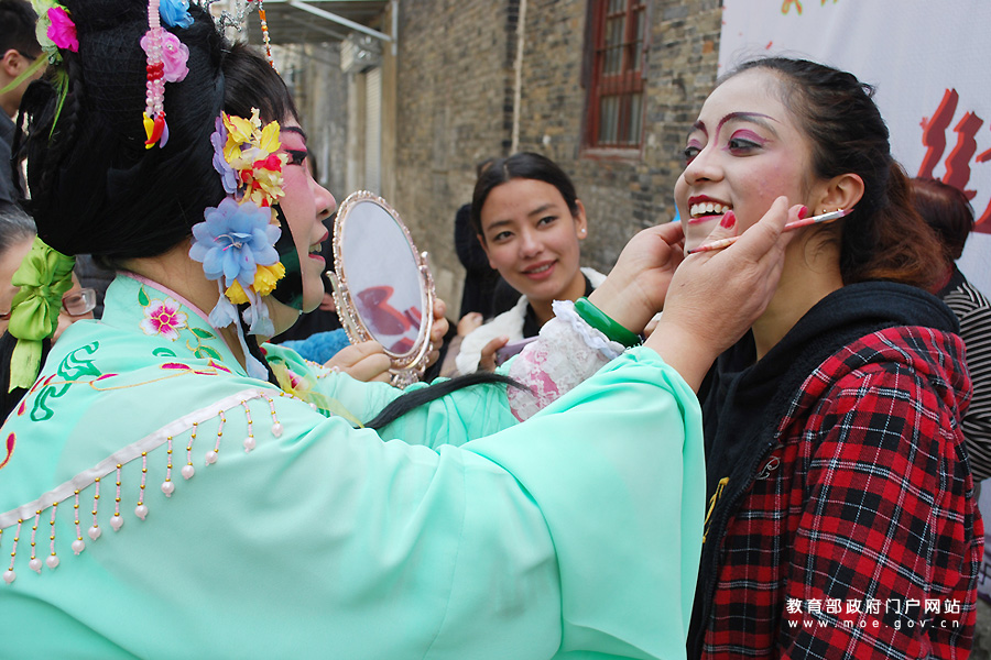 戲曲票友在為江蘇大學的外國留學生化妝。(石玉成 平娜/攝)