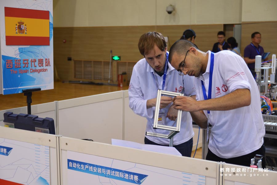 1/0自動化生產線安裝與調試國際邀請賽區,西班牙代表隊選手默契配合。(岱宗/攝 李娜/文)
