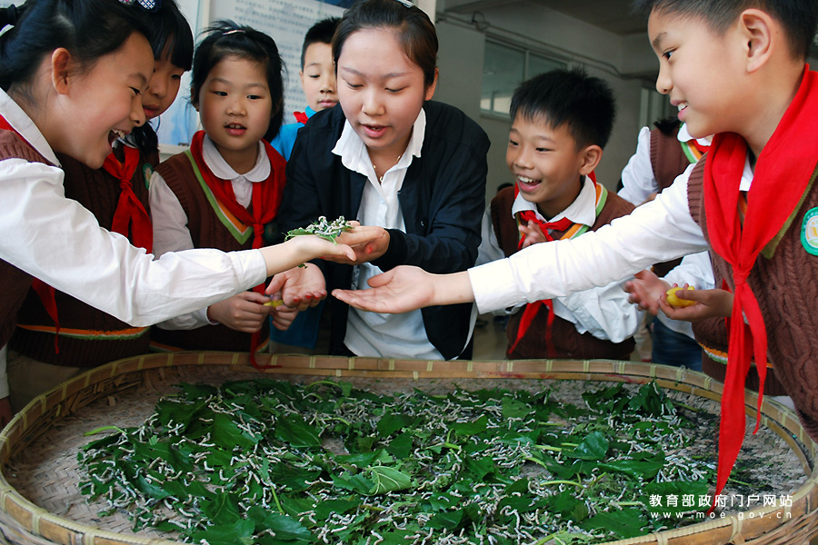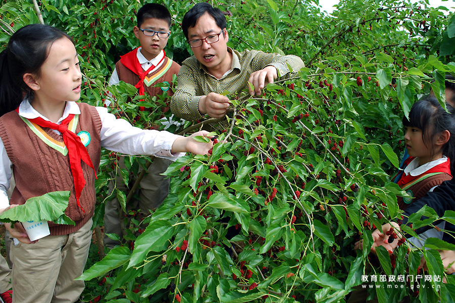 當日,江蘇科技大學志愿者帶著鎮江市中山路小學的學生來到中國農科院蠶業研究所,了解春蠶的飼養過程,走進桑田采摘和品嘗桑葚,在快樂體驗中學習蠶??破罩R,從小增強愛科學、學科學的興趣。(石玉成 任曉妹/攝)