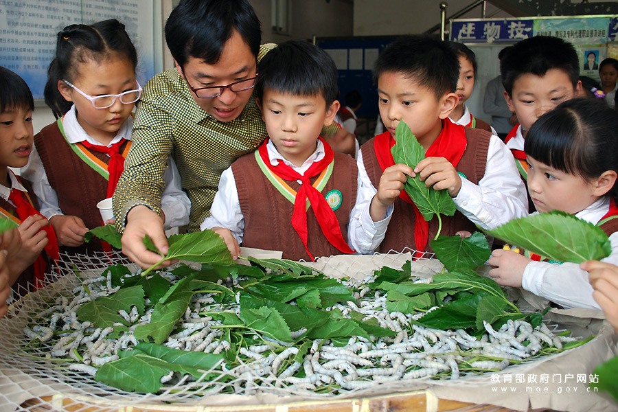 江蘇科技大學志愿者為小學生講解春蠶的飼養過程。(石玉成 任曉妹/攝)