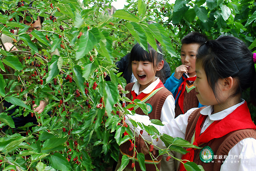 江蘇科技大學志愿者與小學生一起采摘、品嘗桑葚。(石玉成 任曉妹/攝)