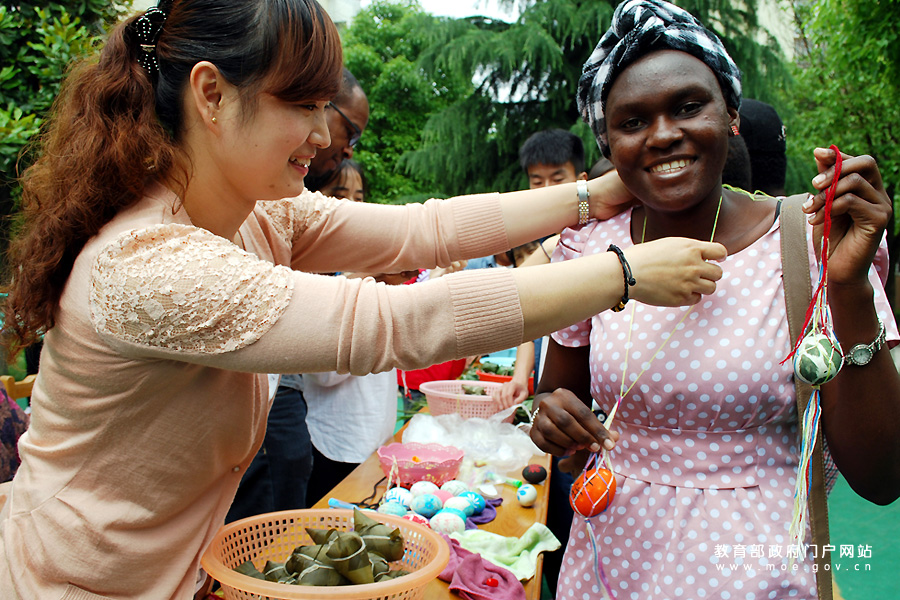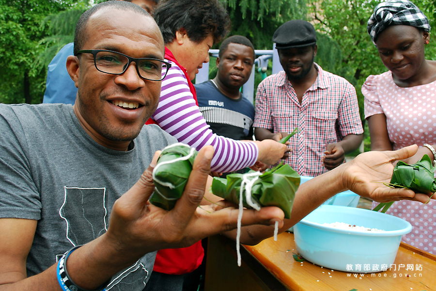 一名外國留學生在展示剛包的粽子。(石玉成 蔣軍/攝)