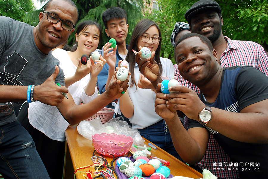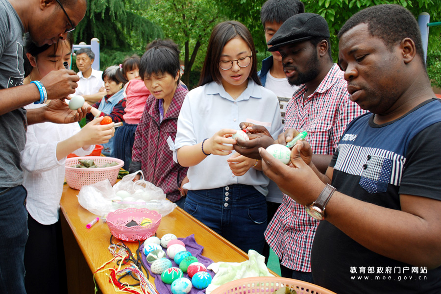 外國留學生在展示畫有端午民俗的彩蛋。(石玉成 蔣軍/攝)