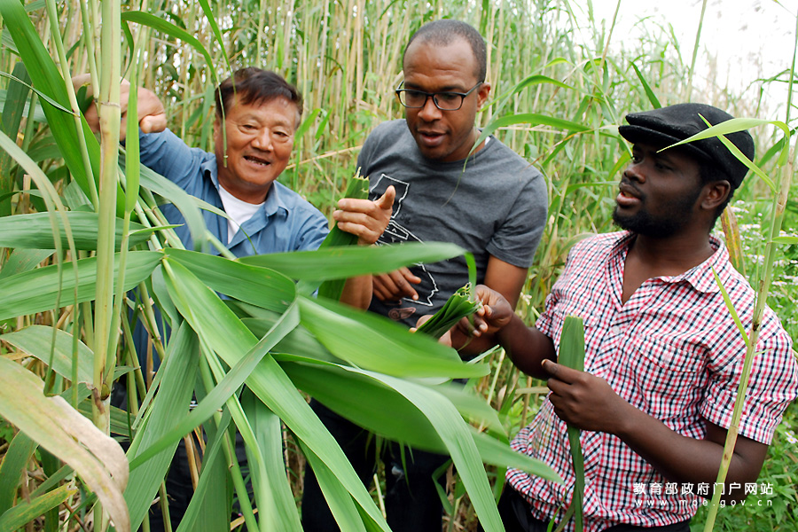 社區居民在指導外國留學生打粽葉。(石玉成 蔣軍/攝)