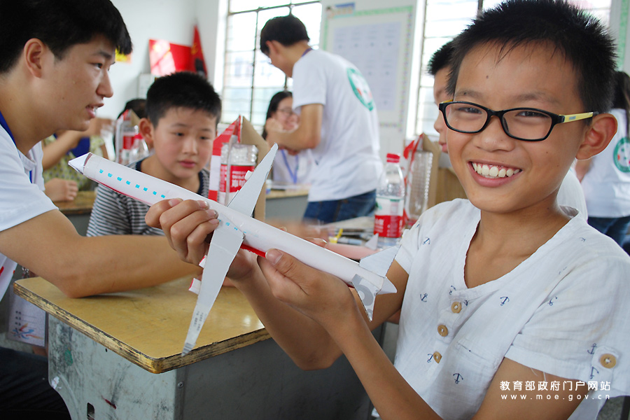 一名留守兒童在展示剛剛制作的科普模型。(石玉成 丁永萍/攝)