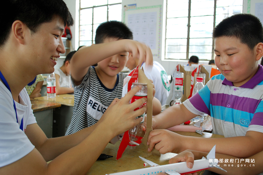志愿者在指導留守兒童學習手工制作。(石玉成 丁永萍/攝)