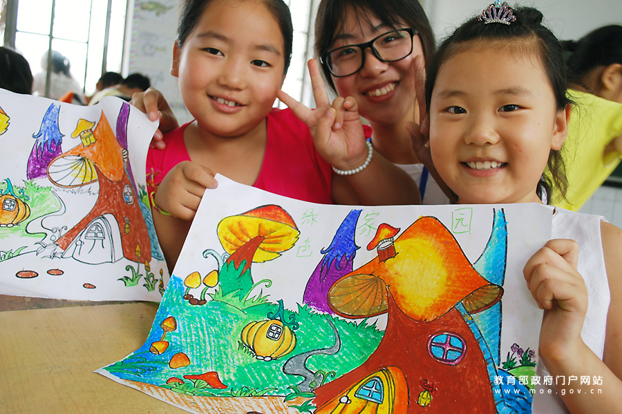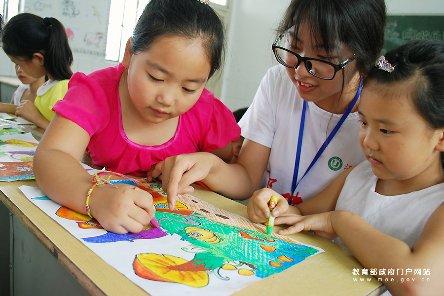 志愿者在指導留守兒童畫畫。(石玉成 丁永萍/攝)