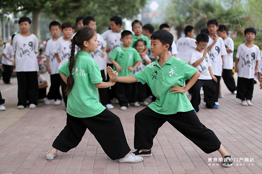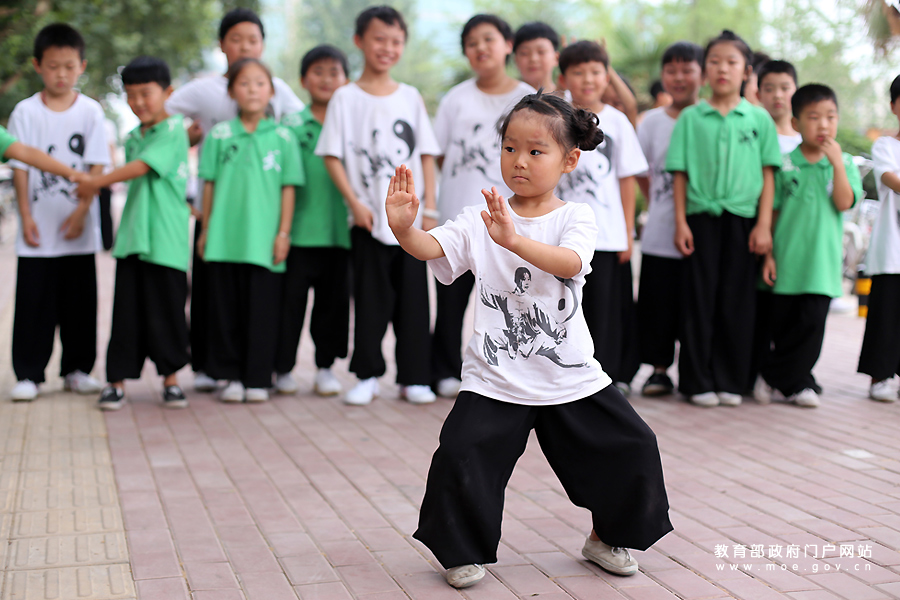 河南省溫縣子夏公園一家太極拳輔導班的一名小學員在學習太極拳。暑假期間,全國各地眾多中小學生紛紛慕名來到太極拳發源地——河南省溫縣學習太極拳,強身健體,磨煉意志,在運動中“武”出精彩暑假。(徐宏星/攝)