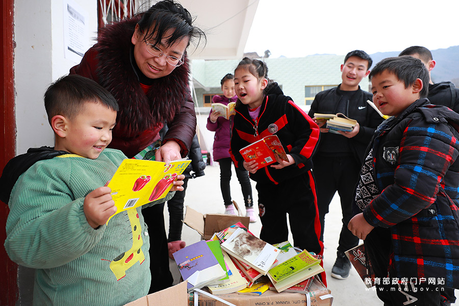 文縣東壩中學(九年一貫制學校)的學生們領到心儀的圖書后一起回家。甘肅省教育廳駐文縣口頭壩鄉高家山村幫扶工作隊為寒假中的孩子們準備了一份特殊禮物——二百多本少兒讀物,意在讓學生遠離電視、遠離手機,過一個快樂有益的書香寒假。(張學軍、尹曉軍/攝)