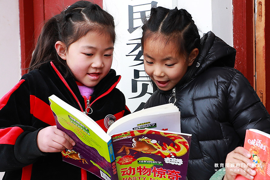 東壩中學(九年一貫制學校)的學生一起閱讀少兒圖書。(張學軍、尹曉軍/攝)