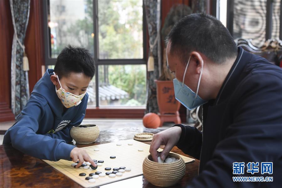 2月6日,重慶市云陽縣實驗小學四年級學生王琮玚在家中和爸爸下圍棋。(新華社記者 王全超/攝)