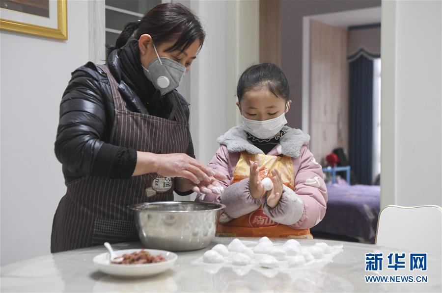 2月6日,重慶市云陽縣海峽小學一年級學生周彥希在家人的指導下學習包湯圓。(新華社記者 王全超/攝)