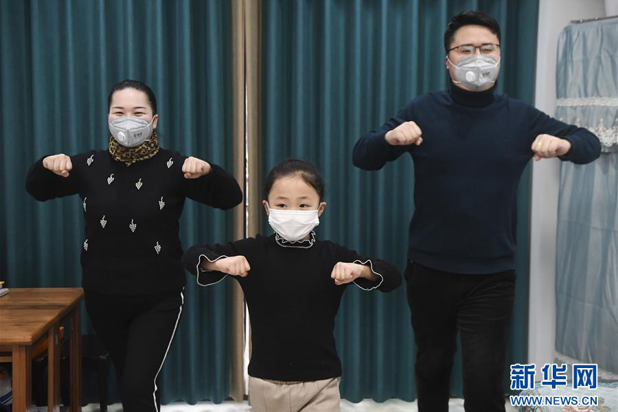 2月6日,重慶市云陽縣海峽小學一年級學生周彥希和爸爸媽媽一起在家中做廣播體操。(新華社記者 王全超/攝)