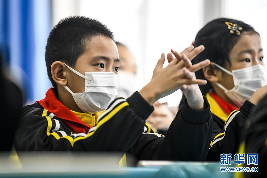 3月23日,在位于烏魯木齊的新疆教育學院實驗小學二年級2班,學生們跟老師學習“七步洗手法”。(新華社記者 王菲/攝)