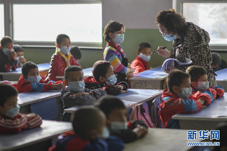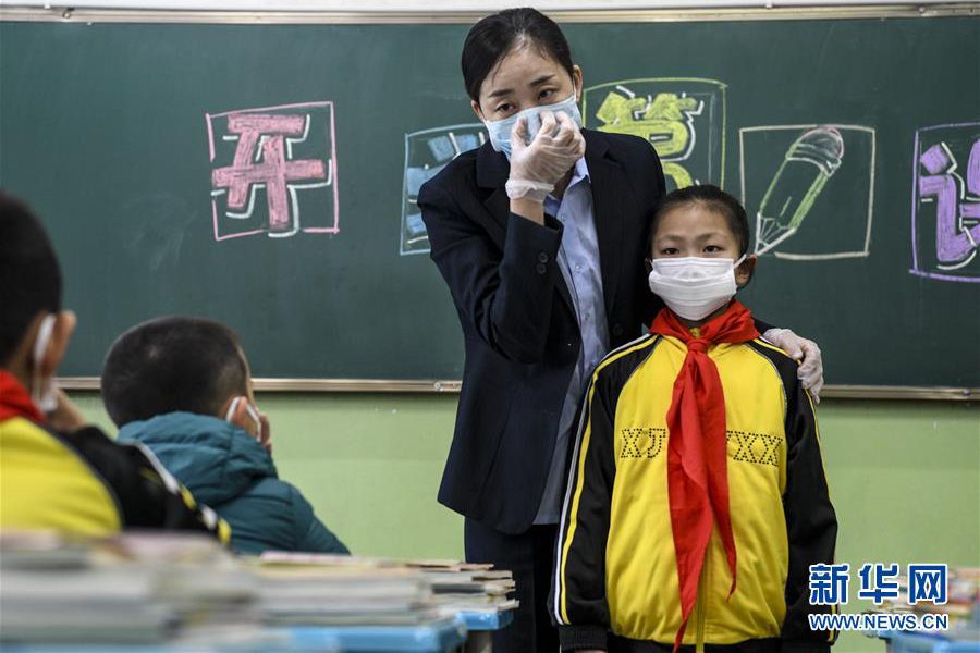 3月23日,在位于烏魯木齊的新疆教育學院實驗小學二年級2班,班主任劉娟為學生講解正確佩戴口罩的方法。(新華社記者 王菲/攝)