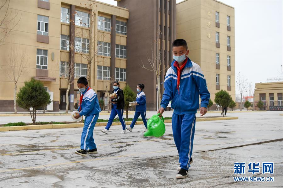 3月23日,在新疆喀什市東城第八初級中學,學生在打掃衛生。(新華社記者 丁磊/攝)