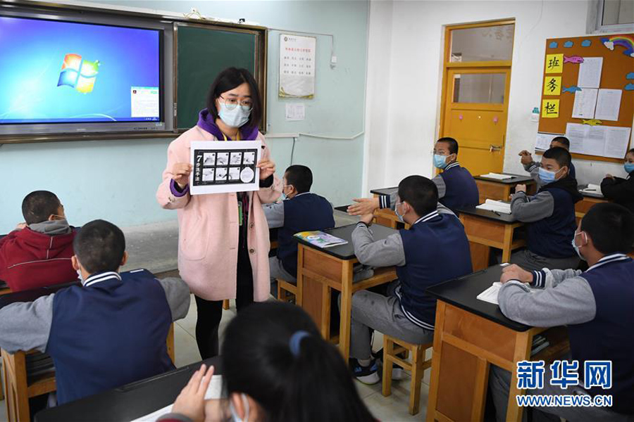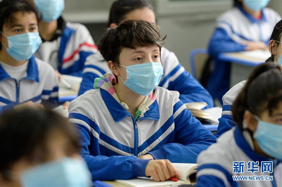 3月23日,新疆伊犁哈薩克自治州霍城縣瞻德中學學生在上開學第一課,老師為學生講解防疫知識。(新華社記者 沙達提/攝)