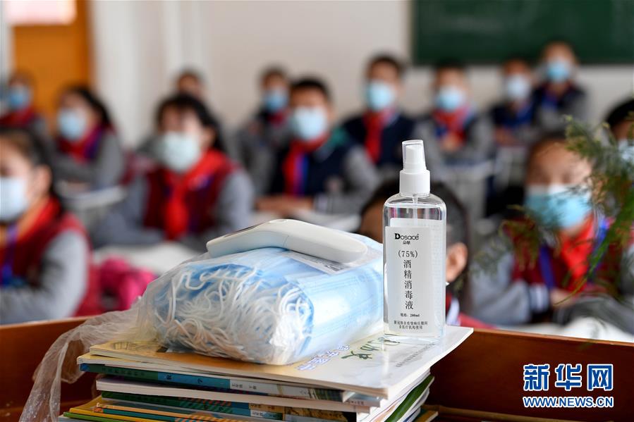 3月23日,新疆伊犁哈薩克自治州霍城縣瞻德中學教室里,講臺上擺放著口罩、酒精消毒液等物品。(新華社記者 沙達提/攝)