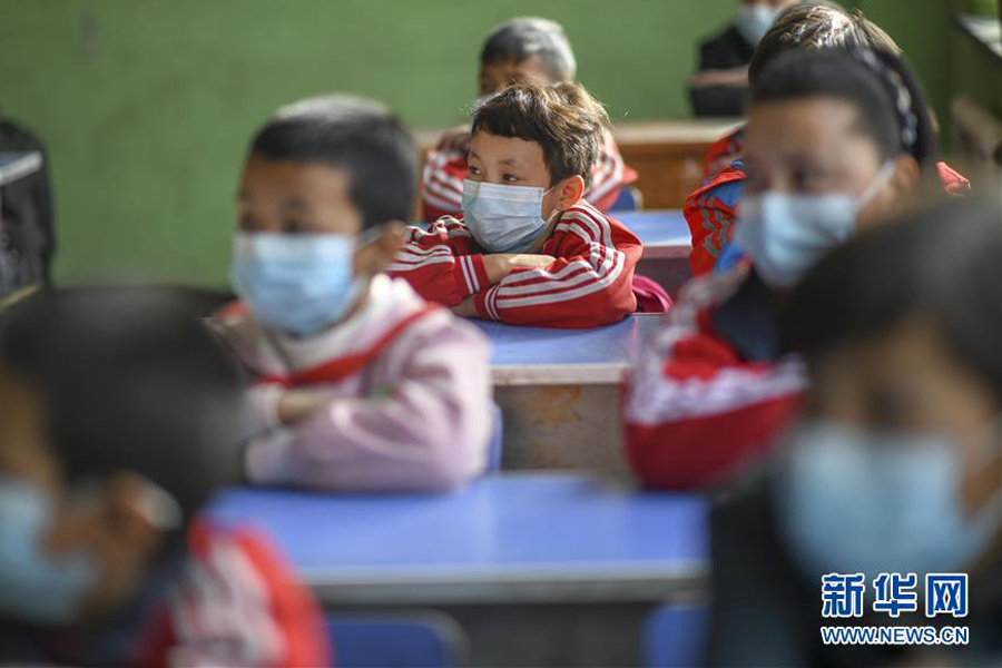 3月23日,在新疆和田地區墨玉縣阿克薩拉依鄉烏尊艾日克小學里,一年級的學生在學習防疫知識。 (新華社記者 趙戈/攝)
