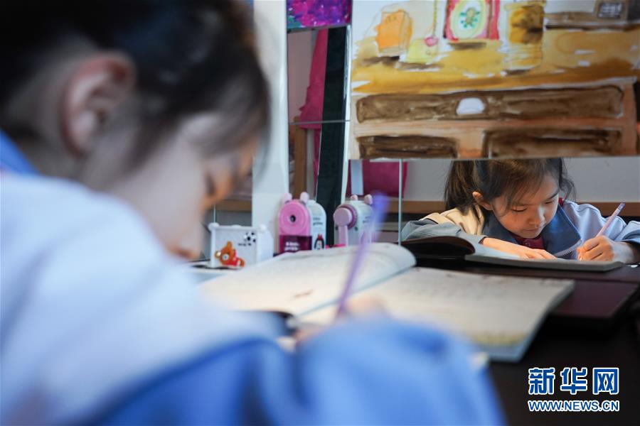 4月13日,北京市朝陽師范學校附屬小學(西壩河校區)三年級學生馬紫涵在家中按照新學期課表預習語文課程。(新華社記者 鞠煥宗/攝)