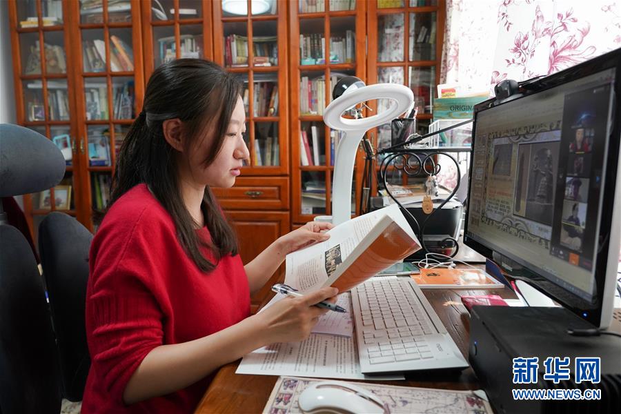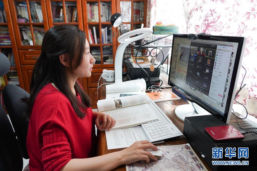4月13日,人大附中西山學校高一歷史老師李響在家中為學生上課。(新華社記者 鞠煥宗/攝)