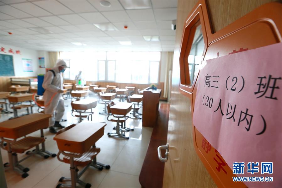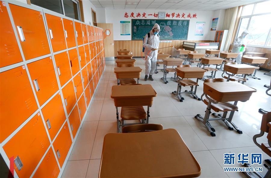 4月14日,山東省青島通濟實驗學校的工作人員在對教室進行消毒。(新華社發 梁孝鵬/攝)