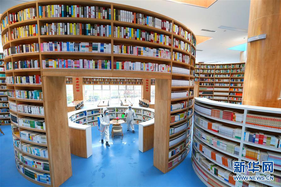 4月14日,山東省青島通濟實驗學校的工作人員在對校園圖書館進行消毒。連日來,山東省青島市的高中開展校園防疫演練、公共場所消殺、教職員工培訓等各項開學準備工作,保障高中畢業年級學生安全有序復課。據悉,山東省高中畢業年級將于4月15日正式開學復課。(新華社發 梁孝鵬/攝)