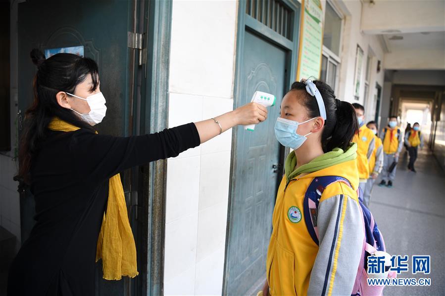 4月26日,合肥市肥西縣紫蓬鎮中心學校學生入校接受體溫測量。當日,安徽省合肥市小學四、五、六年級及高一、初一年級開學復課。(新華社記者 劉軍喜/攝)