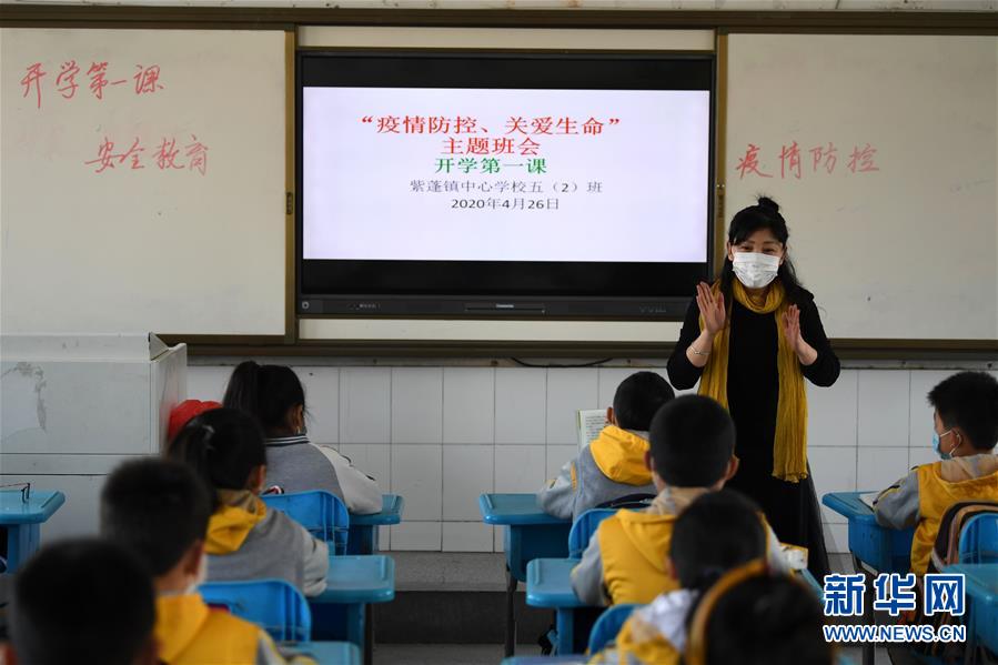 4月26日,合肥市肥西縣紫蓬鎮中心學校老師在為學生上開學第一課。(新華社記者 劉軍喜/攝)