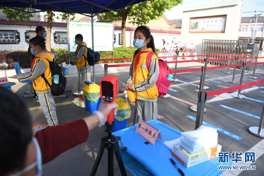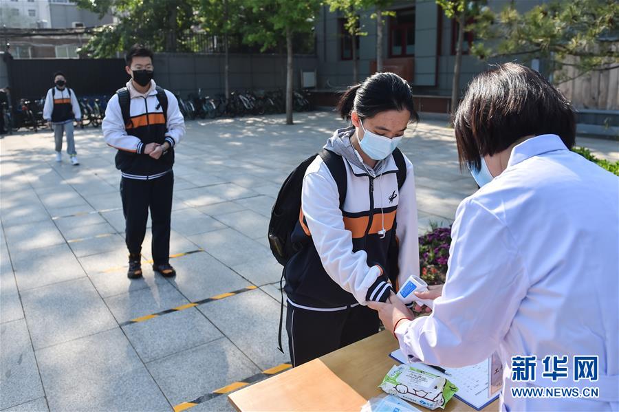 4月27日,北京一六一中學的學生排隊測量體溫。(新華社記者 彭子洋/攝)