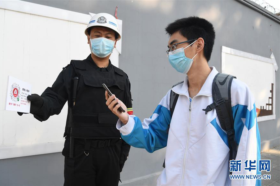 4月27日,在位于北京市海淀區的中國農業大學附屬中學,一名高三年級學生在進入校園前掃描“健康碼”。(新華社記者 任超/攝)