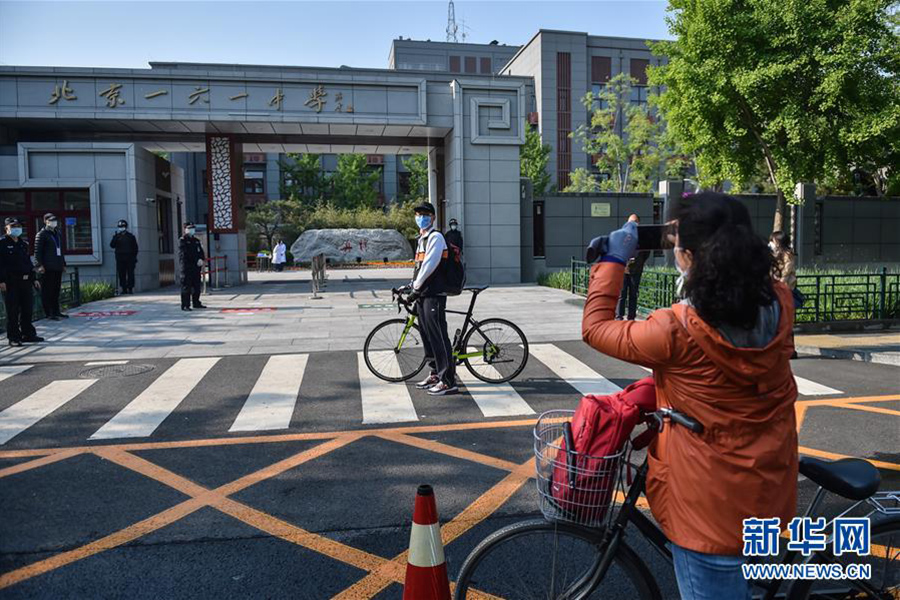 4月27日,在北京一六一中學的校門前,一位母親給復課的孩子拍照留念。(新華社記者 彭子洋/攝)