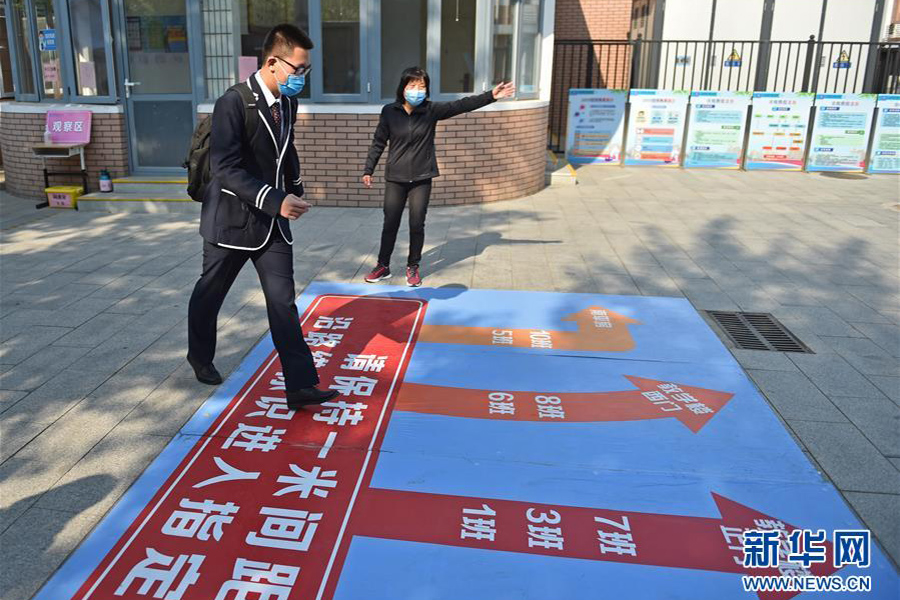 4月27日,在北京市廣渠門中學,一名高三年級的學生按路面指示圖引導前往教室。(新華社發 陳鐘昊/攝)