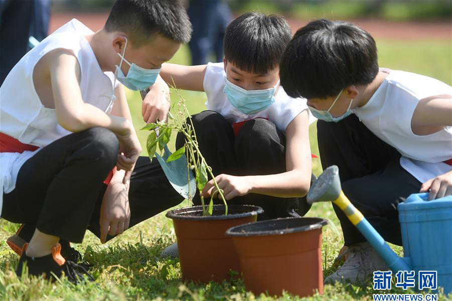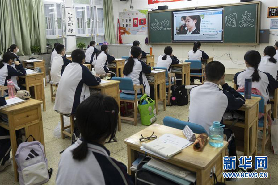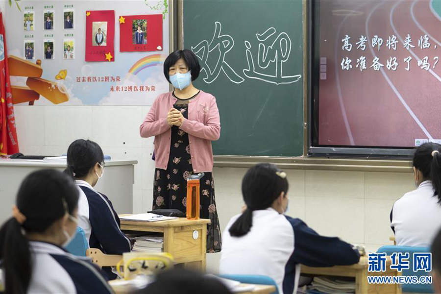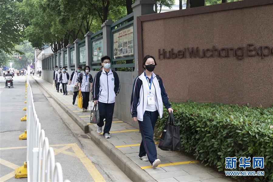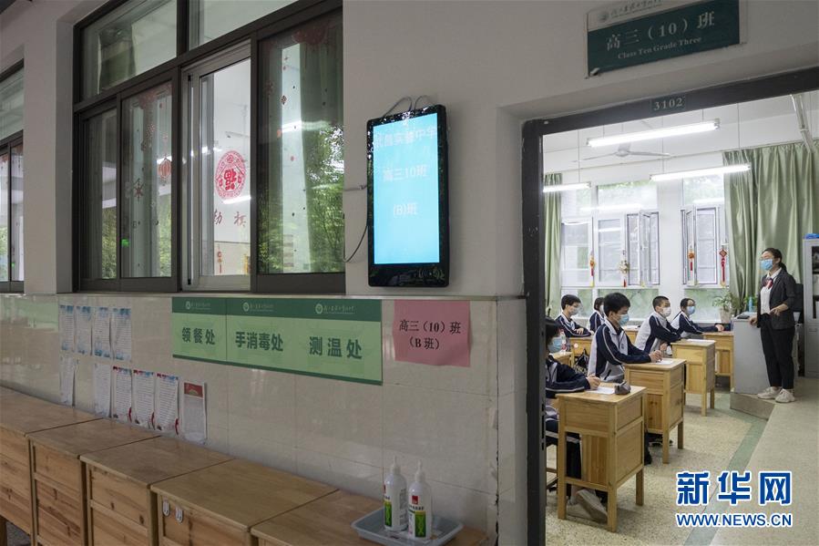 5月6日,湖北省武昌實驗中學的高三年級學生走進校園。 當日,武漢首批121所學校高三年級正式復學,學生返校上課。據了解,開學前,所有校園均開展了衛生清潔和預防性消殺工作,所有學生返校前須進行健康檢測。(新華社記者 熊琦/攝)