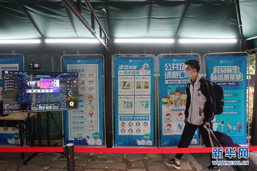5月6日,在湖北省武昌實驗中學,一名高三年級的學生通過疫情防控監測點,經過紅外測溫后進入校園。(新華社記者 熊琦/攝)