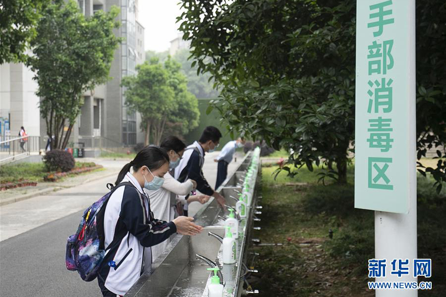 5月6日,在湖北省武昌實驗中學,高三年級的學生入校后在手部消毒區洗手。(新華社記者 熊琦/攝)