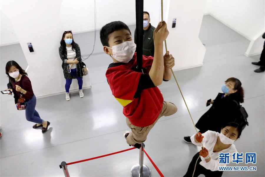 5月11日,在河北省石家莊公共安全體驗館,講解員引導小朋友體驗地震逃生。(新華社發 梁子棟/攝)