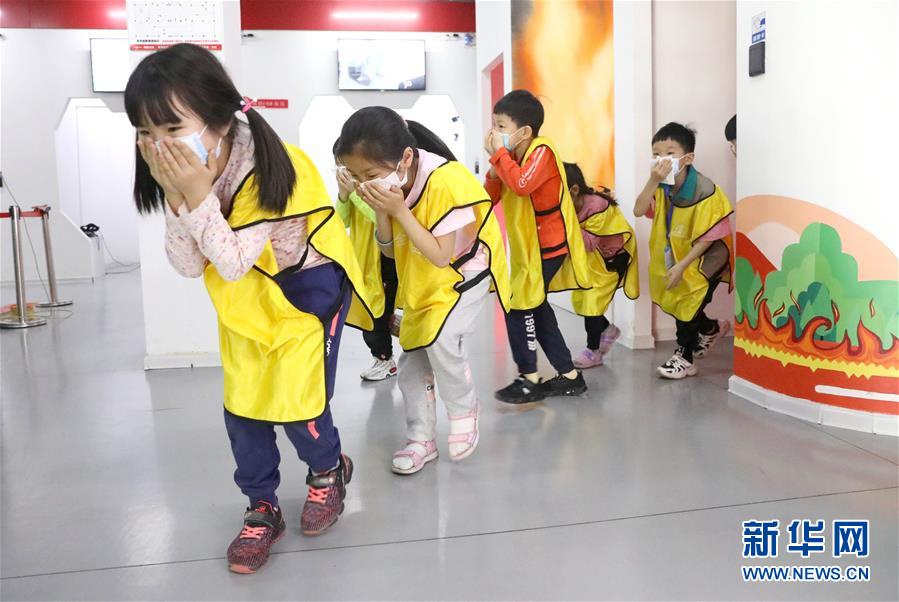5月11日,在河北省石家莊公共安全體驗館,小朋友體驗煙霧逃生通道。(新華社發 梁子棟/攝)