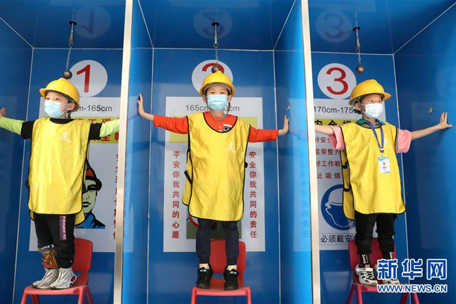 5月11日,在石家莊公共安全體驗館,小朋友在進行安全帽撞擊體驗。(新華社發 梁子棟/攝)