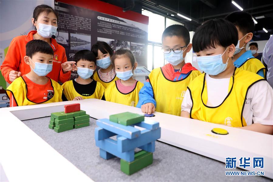 5月11日,在石家莊公共安全體驗館,小朋友通過演示裝置了解各震級對不同建筑類型的破壞力。(新華社發 梁子棟/攝)